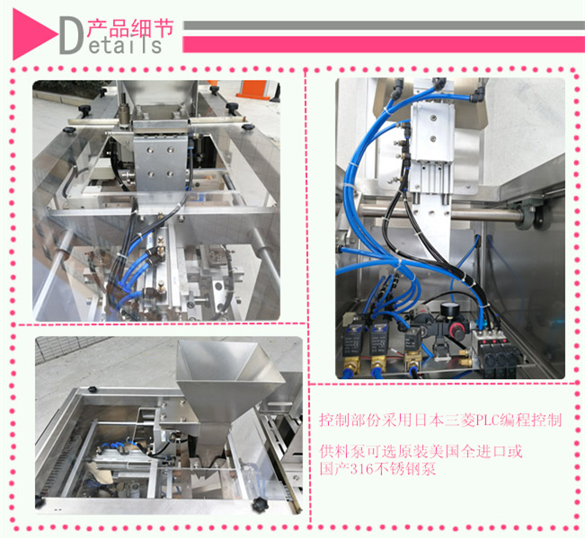 3、電腦操作系統(tǒng)采用進口彩色觸摸屏控制,數字人性化管理,并設有缺料、缺包材自動停機及時報警等多種先進功能,使操作更簡單,維修更方便;
