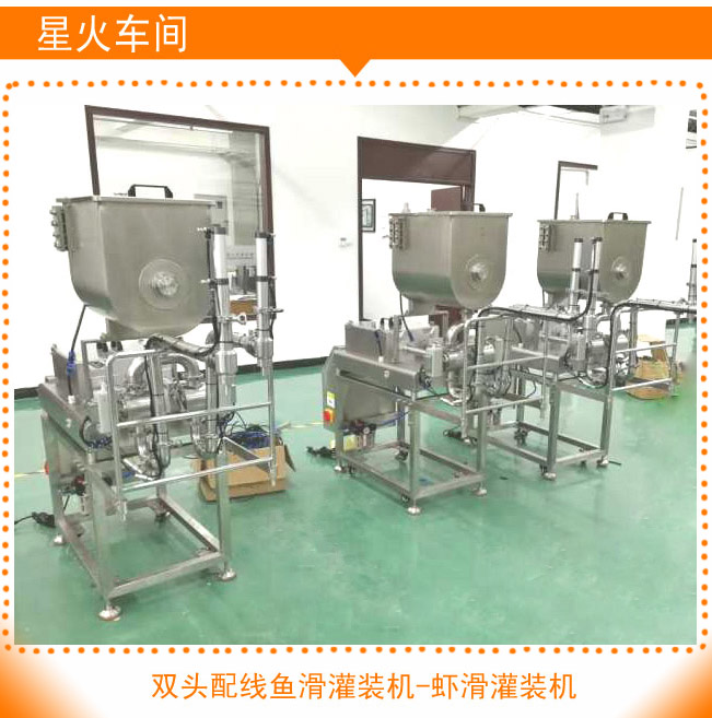 雙頭配線雙魚滑灌裝機-蝦滑灌裝機是星火專利產(chǎn)品,采用全不銹鋼制作,方便清潔,衛(wèi)生安全,該機設計合理,蝦滑灌裝機材質(zhì)優(yōu)良,與物料接觸部件采用304不銹鋼加工制作,符合GMP認證要求。具有防腐、能較好的適應潮濕等惡劣環(huán)境。專門針對粘稠物料尤其適合含有顆粒的豆醬、魚滑、蝦滑、墨魚滑、牛肉滑等產(chǎn)品,采用進口氣缸、電器元件,質(zhì)量更穩(wěn)定,配置靈活的腳踏開關和自動灌裝功能,急停開關等